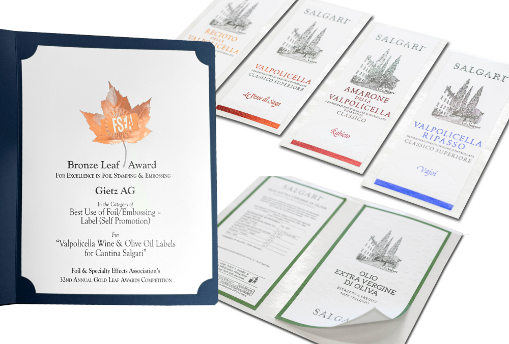 Bronze Award in the Label Self Promotion category for a special project: wine and olive oil labels for the Italian Cantina Salgari.